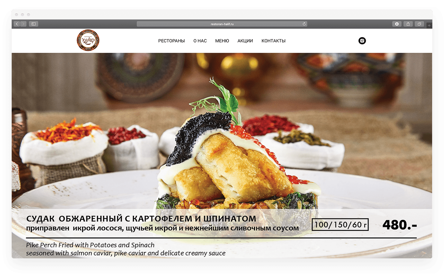 Все меню сайта разбито на главные категории, которые отображены большими плитками. Над фотографиями работал мастер фуд-съемки — Игорь Горький. Все блюда были оформлены в едином стиле с уникальными декорациями.