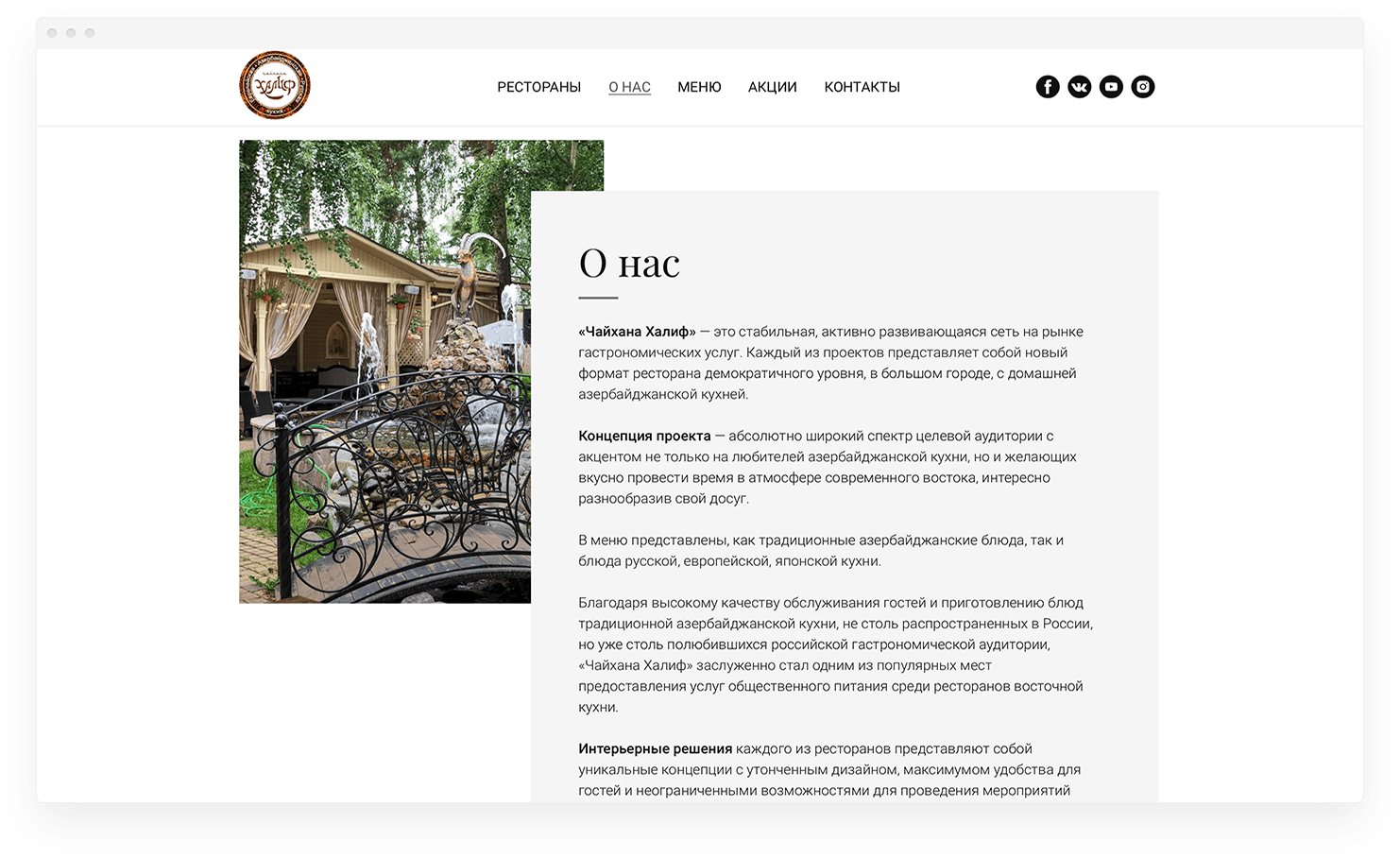 На странице представлено описание сети ресторанов, их миссия, концепция проекта, кухня, и интерьер.