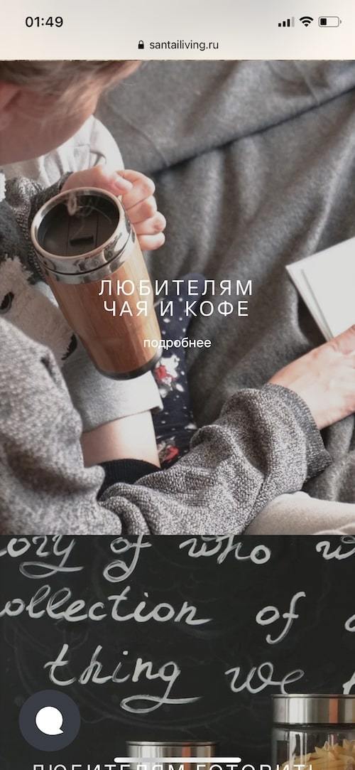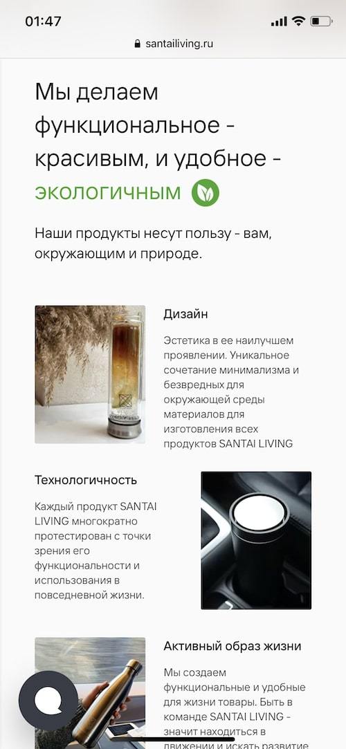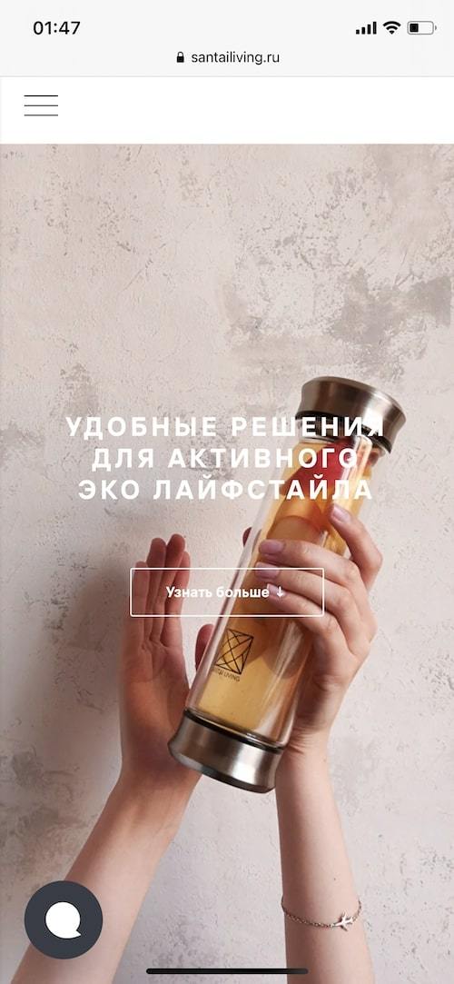 Видеофон на главном экране демонстрирует самые популярные товары. Заголовок не призывает к действию и не продаёт в лоб, а аккуратно и ненавязчиво описывает главные ценности компании.