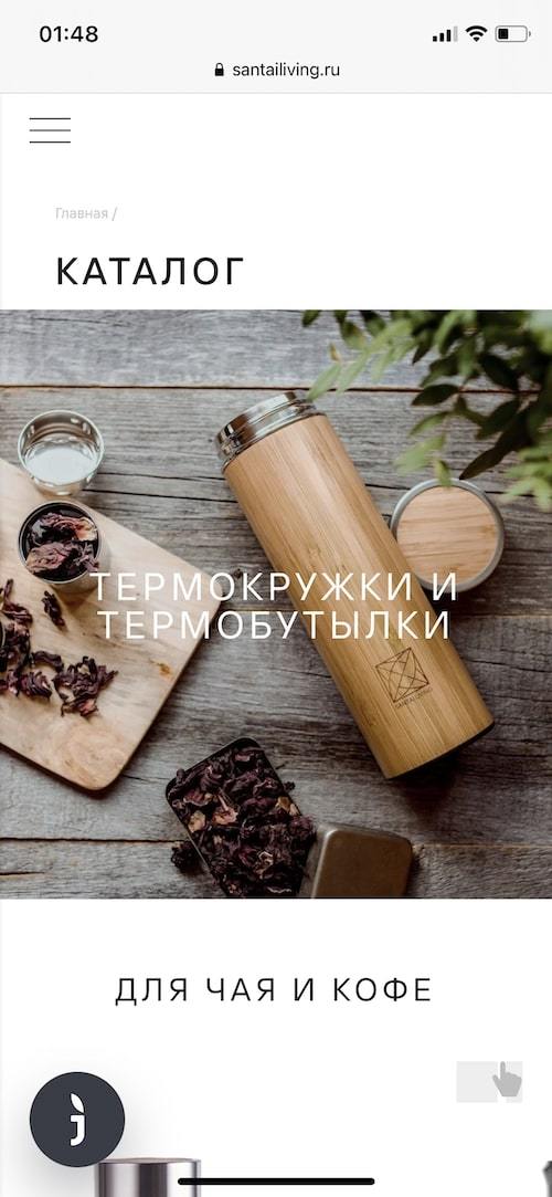 Сделан большой акцент на мобильную адаптацию. Под каждым названием категории находится тематическая подложка, а в карточке товаров находится 2 блока — один для десктопа с залипающим описанием, а другой статичный для мобильных устройств с отдельным блоком-галереей.